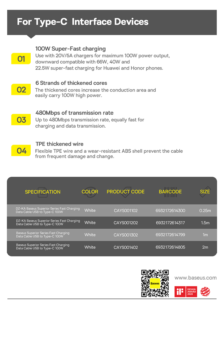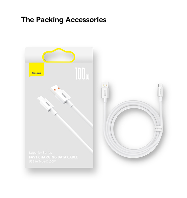 Cable USB to Type-C, 100W, 6A,1m White/Baseus Superior Series Cable/CAYS001302
